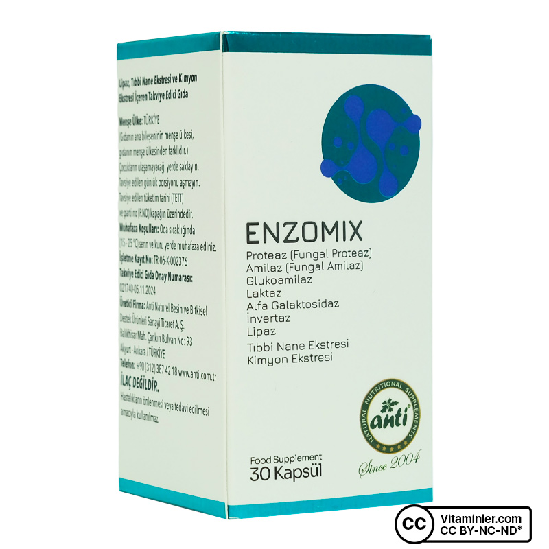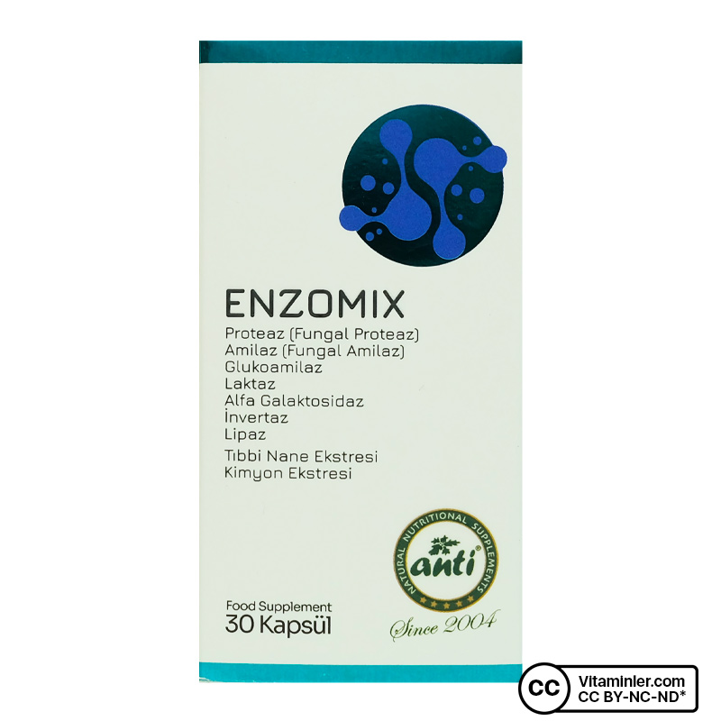 Anti Enzomix 30 Kapsül, sindirim enzimleri ve bitkisel ekstrelerin birleşiminden oluşan özel bir formüle sahiptir. İçeriğinde amilaz, laktaz ve lipaz gibi sindirim enzimlerinin yanı sıra kimyon ekstresi ve tıbbi nane ekstresi gibi bitkisel kaynaklar da bulunur. Bu sayede farklı içeriklerin bir araya getirildiği Anti Enzomix, dengeli bir gıda takviyesi alternatifi sunar.