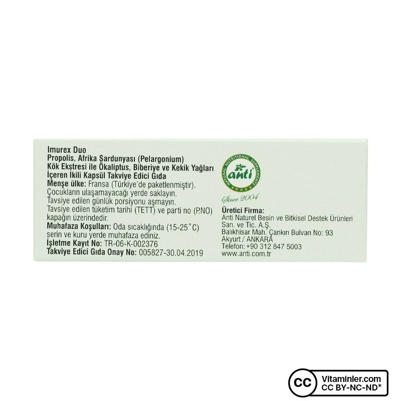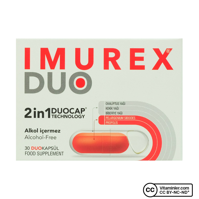 Anti Imurex Duo 30 Kapsül, tamamı farmasötik kalite ekstrelerden oluşan ve kekik yağı, okaliptus yağı ile biberiye yağı gibi esansiyel yağları içeren özel bir formülasyona sahiptir. Patentli kapsül teknolojisi sayesinde yağ bazlı bileşenler ile toz formdaki içerikler birbirine karışmadan korunur ve bu sayede iki ayrı form, etkileşime girmeden tüketiciye sunulur. Ayrıca, pelargonium sidoides ekstresi (su ekstresi) ve propolis gibi bileşenler ile içeriği zenginleştirilmiştir.