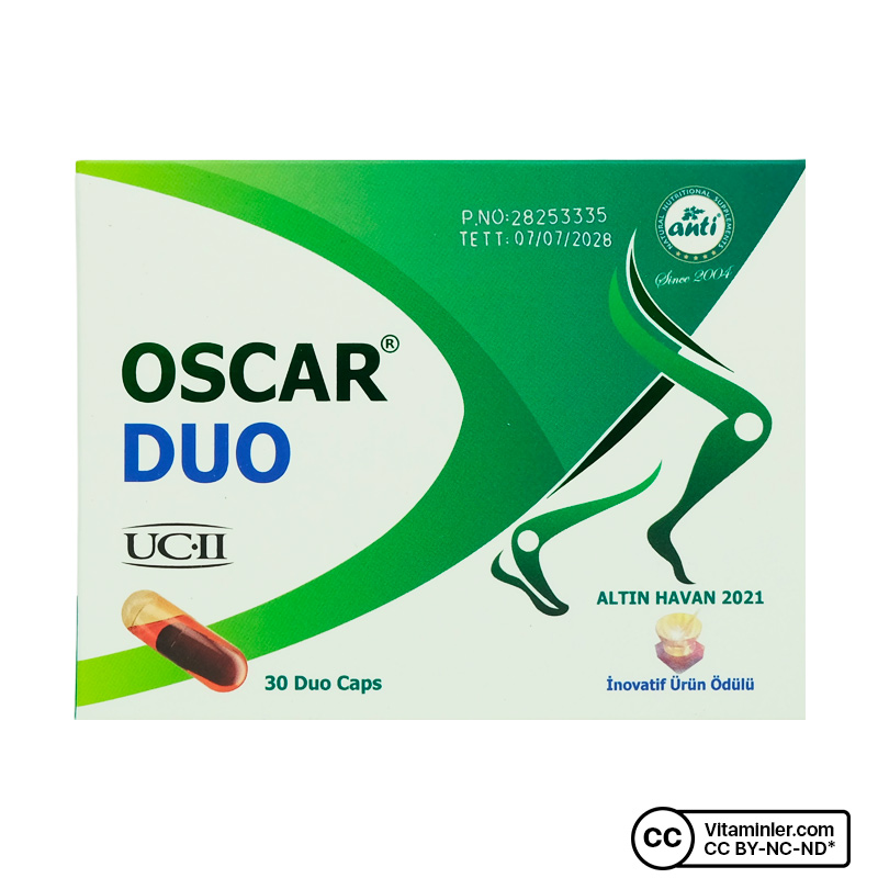 Anti Oscar Duo Tip II Kolajen, eklem ve kıkırdak sağlığını destekleyen özel formülüyle öne çıkan bir takviyedir. İçeriğinde UC-II® kaynaklı Tip II kolajen, Boswellia Serrata ekstresi (Novasol), C vitamini, manganez ve kurkumin gibi bileşenler bulunur. Boswellia ve UC-II patentli ham maddelerle zenginleştirilmiş bu ürün, bitkisel kapsül formu sayesinde kullanım kolaylığı sunar.