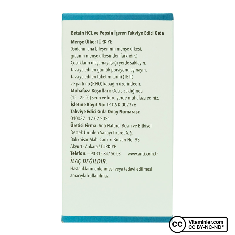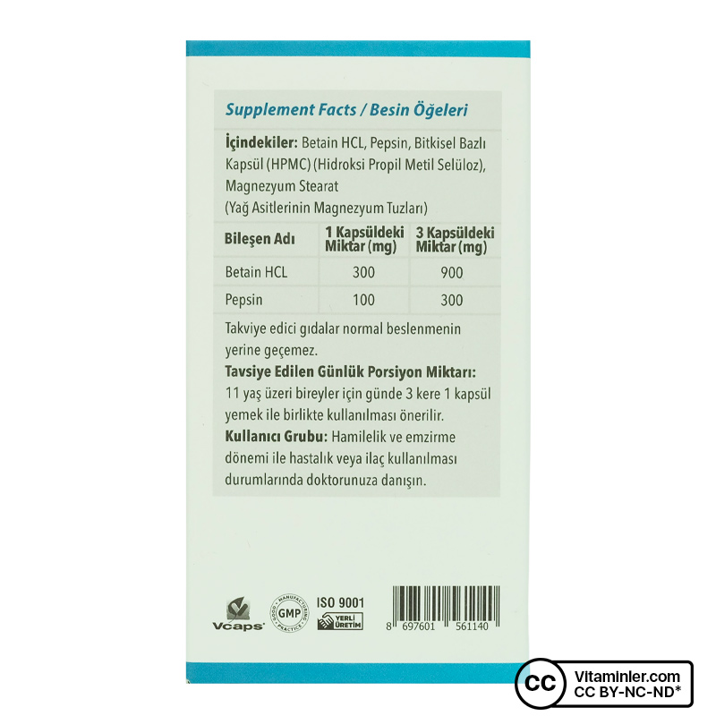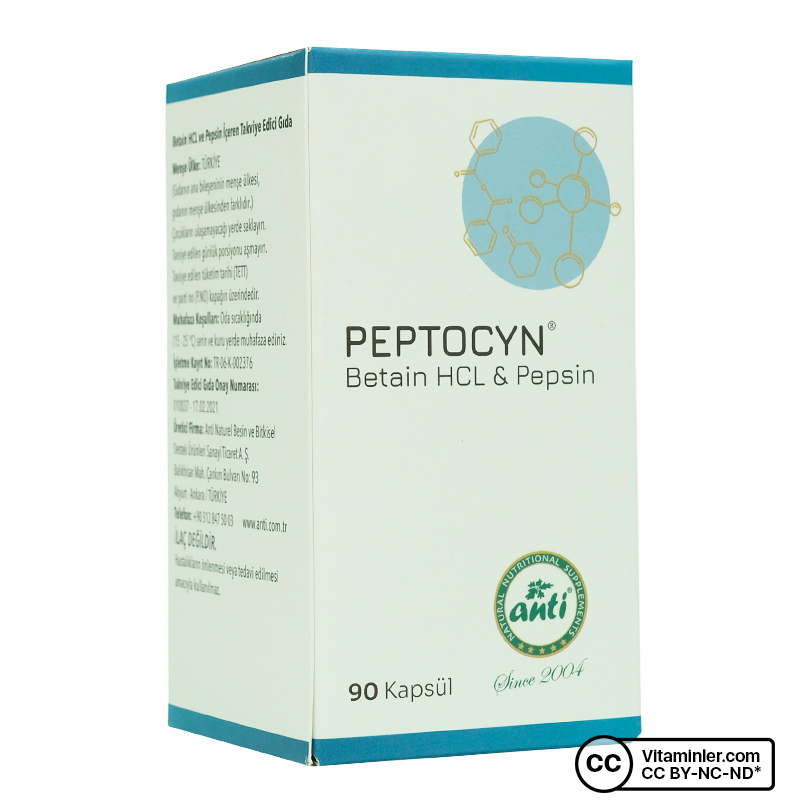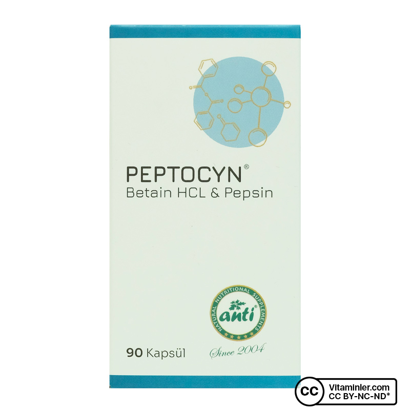 Anti Peptocyn Betain HCL + Pepsin, her servisinde 300 mg betainin asidik formu olan betain HCL sunar. Betainin işlevine yardımcı olması için 100 mg pepsin ile zenginleştirilen formül, şeker, gluten ve koruyucu içermeyen yapısıyla öne çıkar. Vegan tüketime uygun kapsül formu sayesinde de geniş bir kullanıcı kitlesine hitap eder.