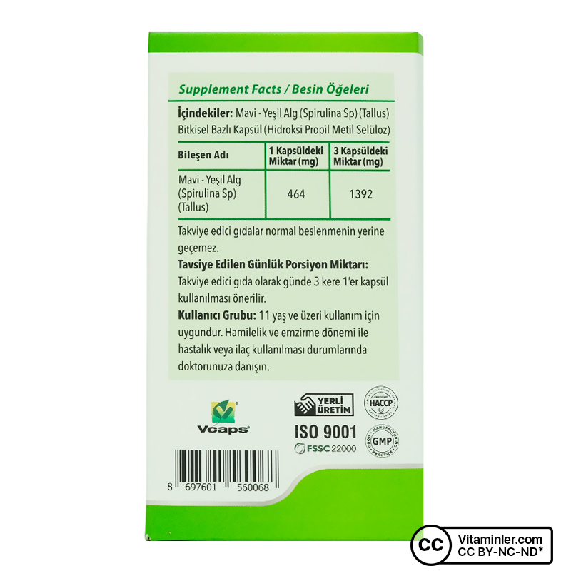 - 1 kapsülde 464 mg, 3 kapsülde 1392 mg spirulina