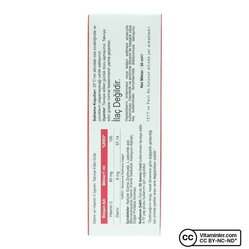 - Her 1 mL’de 8 mg demir ve 80 mg C vitamini.