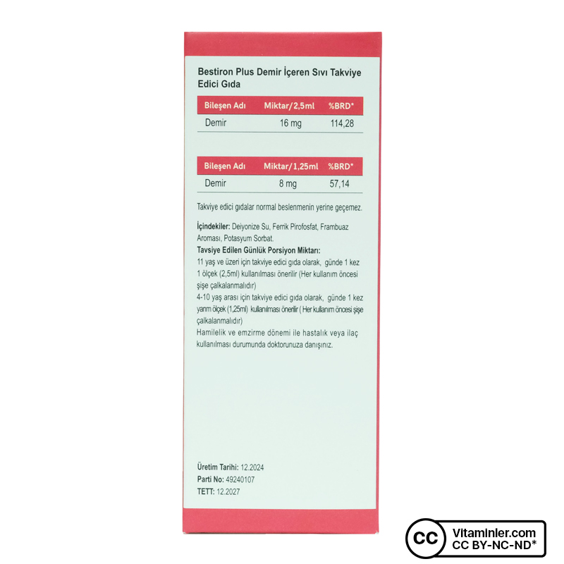 Bestiron Plus Demir Şurup’un kullanım dozu yaş gruplarına göre farklılık göstermektedir. 4–10 yaş arası için günde 1 kez yarım ölçek (1,25 mL), 11 yaş ve üzeri için ise günde 1 kez 1 ölçek (2,5 mL) kullanılması önerilmektedir.