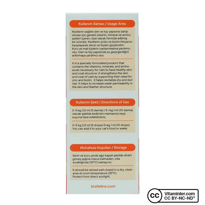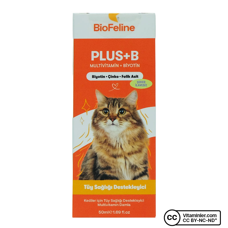 Biofeline plus+B multivitamin kedilerin biotin ve çinko ihtiyacını karşılar. Kedinizin sağlıklı deri ve tüy yapısına sahip olması için gerekli vitamin ve mineralleri içerir. Kuru ve mat tüylere canlılık verir. Derideki kuruluğa ve kaşıntıya karşı cildi nemlendirir, rahatlatır. Sağlıklı deri gelişimini destekler.İçeriğindeki E vitamini deriye zarar verebilecek serbest radikalleri nötralize eder.