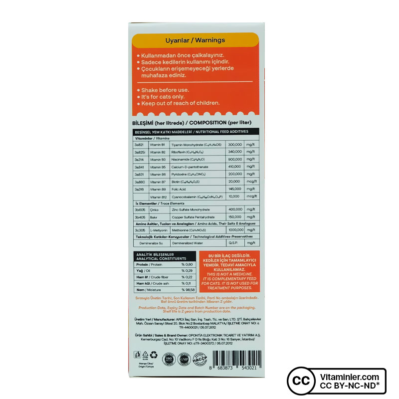 Günlük 0,5 mL ( 5 damla ) olacak şekilde kedinizin mamasına veya suyuna ilave edebilirsiniz.