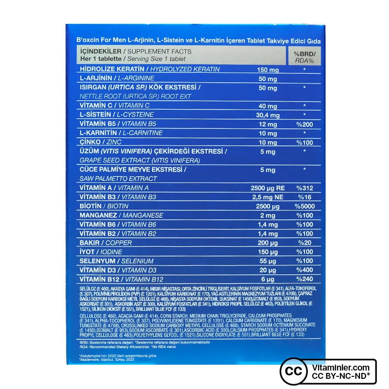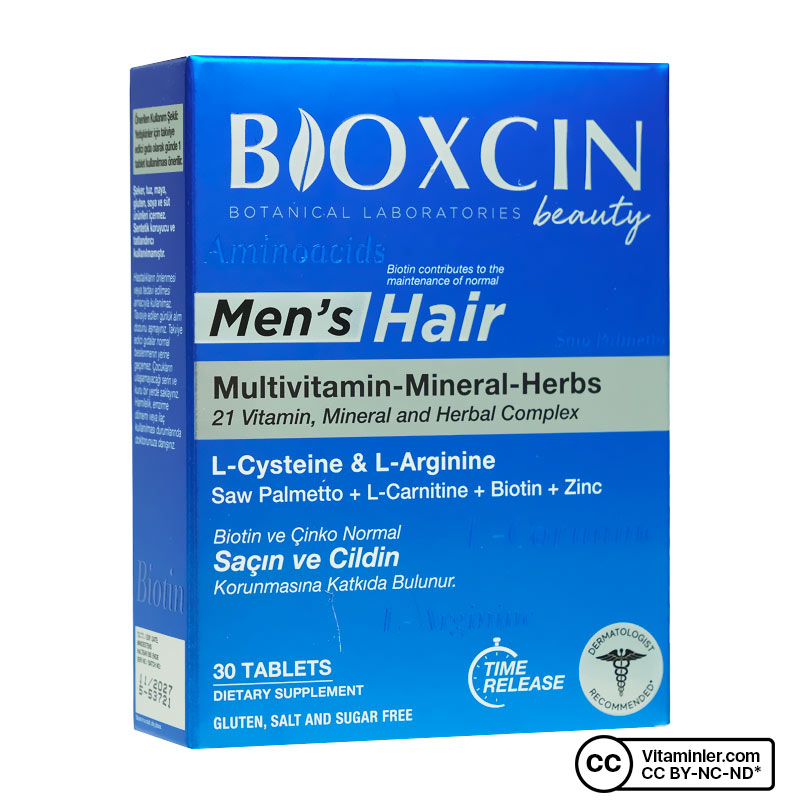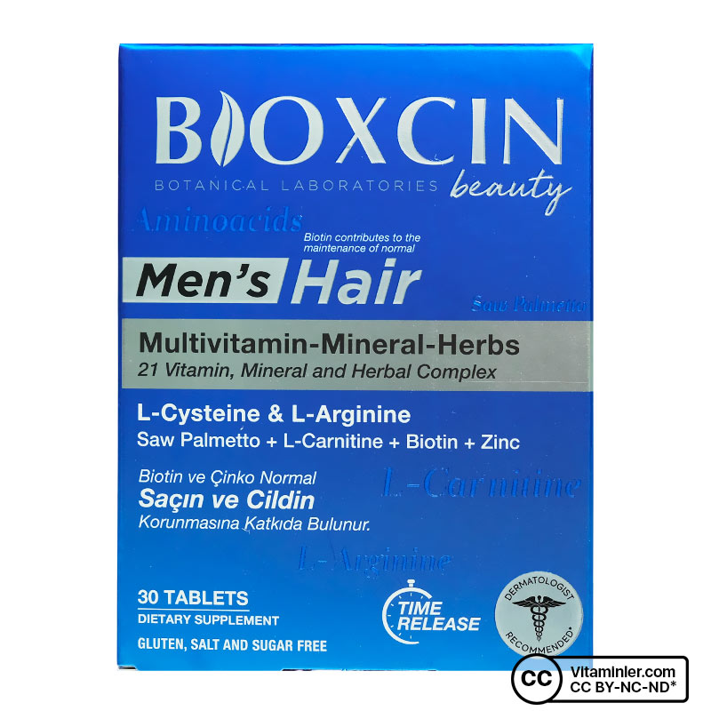 Bioxcin Men's Hair Multivitamin, L-Arginin, Isırgan Kök Ekstresi, L-Sistein, L-Carnitine, Cüce Palmiye Ekstresi, Manganez, Biotin ve Çinko içeren erkek tüketicilerin kullanımına özel olarak geliştirilmiş takviye edici gıdadır. Zaman salınım teknolojisine sahiptir. Şeker, tuz, maya, glüten, soya ve süt ürünleri içermez. Sentetik koruyucu ve tatlandırıcı kullanılmamıştır.