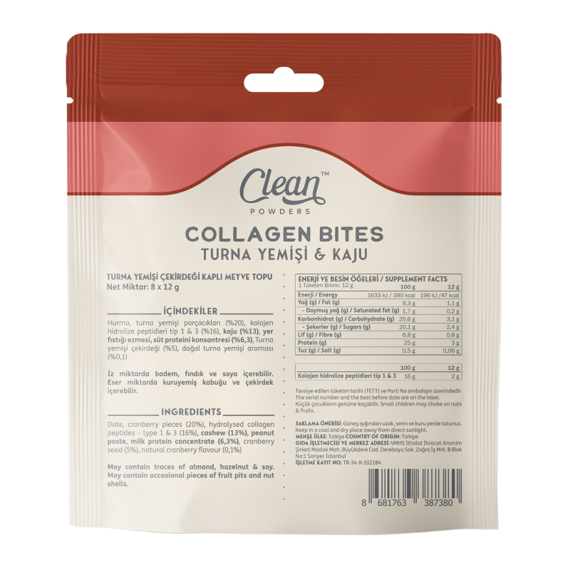 Clean Powders Collagen Bites 96 Gr, turna yemişi çekirdeğiyle kaplanmış, içeriğinde kaju fıstığı bulunan ve kolajen içeren meyve toplarıdır. Zengin içeriğiyle dikkat çeken Collagen Bites, her bir porsiyonunda 3 gram protein sunar. Ayrıca, 2 gram Tip 1&3 hidrolize kolajen içeriğiyle günlük kolajen alımınızı kolay ve lezzetli bir şekilde destekler. Her bir top yalnızca 47 kalori içerir ve gluten barındırmaz.