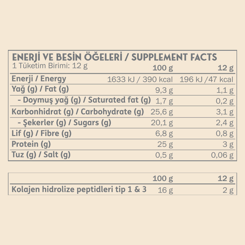 - Bir porsiyonu 2 g Tip 1&3 hidrolize kolajen peptitleri sunar.