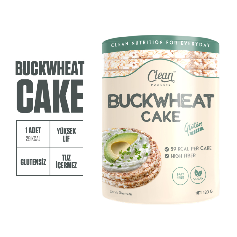 Clean Powders Buckwheat Cake; %100 karabuğdaydan üretilmiştir. Bir dilim (1 adet) Buckwheat Cake yalnızca 29 kcal içerir. İçeriğinde tuz bulunmaz ve her tarife kolayca adapte edilebilir. Ayrıca; vegan tüketime uygundur ve glutensizdir.