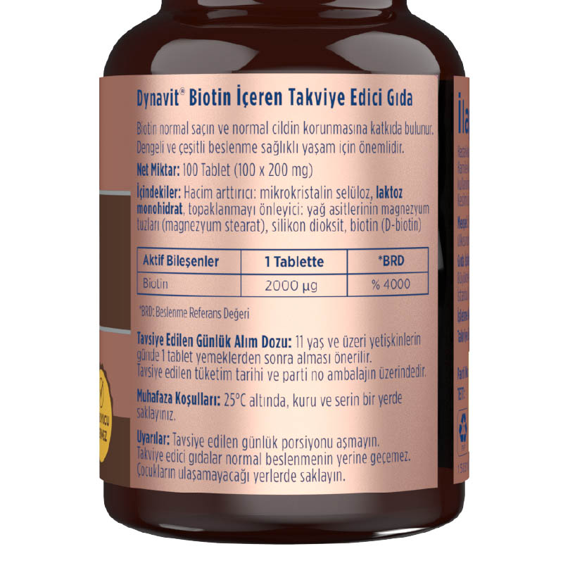 Dynavit Biotin'in her tabletinde 2000 mcg biotin (B7)vitamini bulunmaktadır. Biotin suda çözülebilen bir vitamin türüdür.