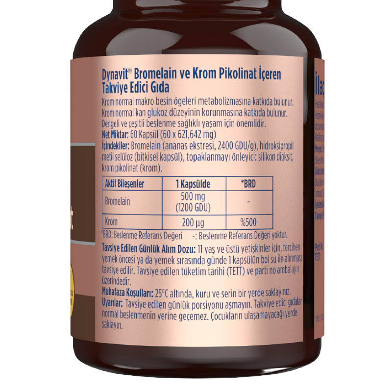 - Her bir kapsülde 500 mg bromelain ve 200 mcg krom içerir.