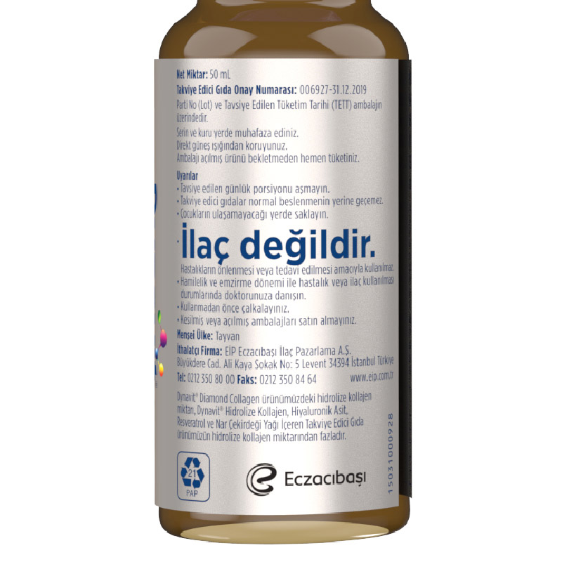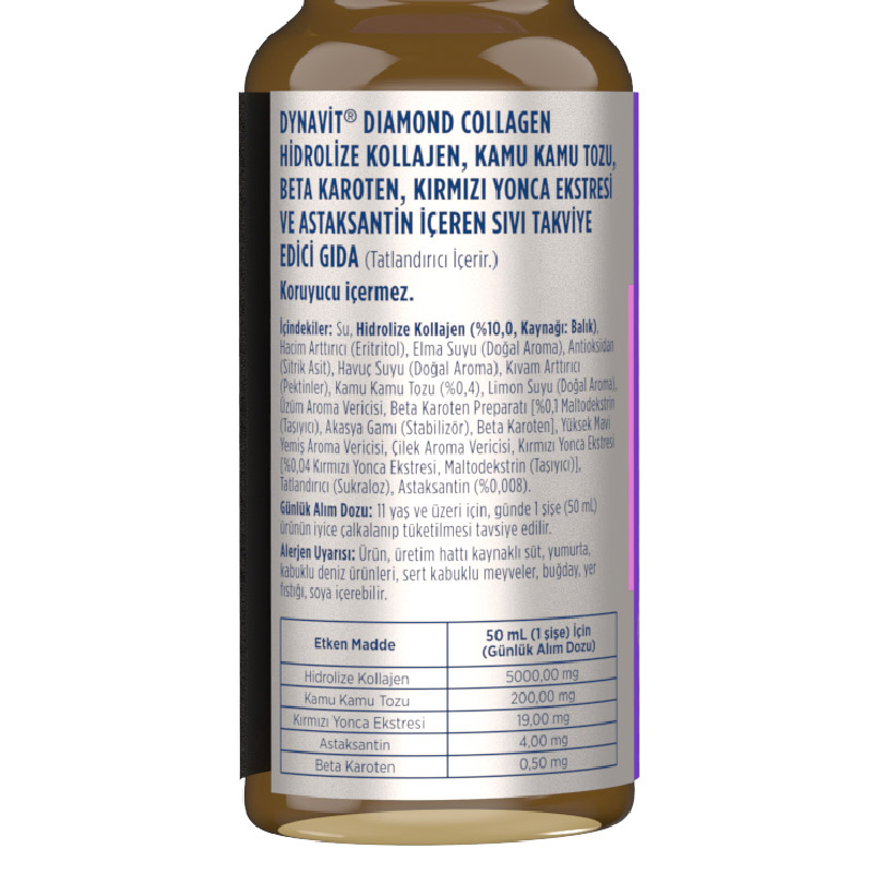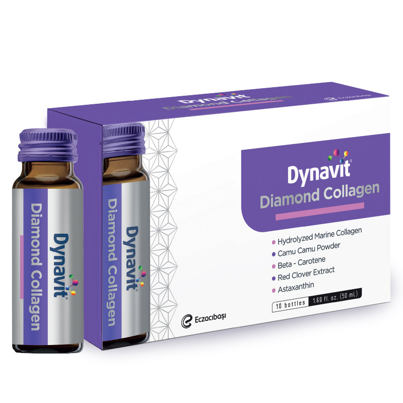 Dynavit Diamond Collagen, 1 şişede (50 mL) 5000 mg hidrolize kollejeni içeren takviye edici bir gıdadır. Morina balığının derisinden elde edilen hidrolize balık kollajeni içerir. Kolajen ,cilt ve kas hücrelerinde bulunan kolajen insan vücudunun neredeyse 3’te 1’ini oluşturan bir protein türüdür.