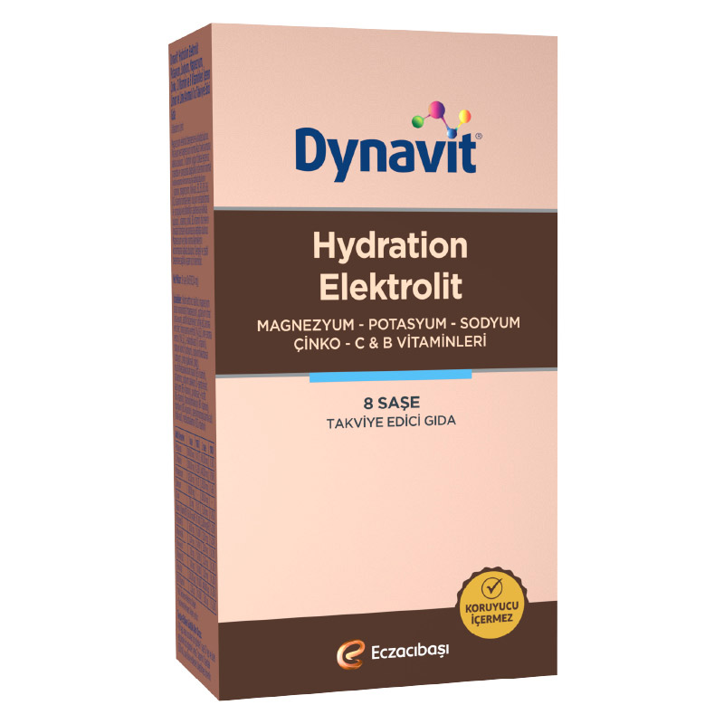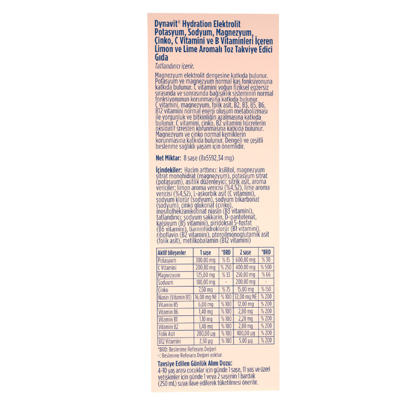 Dynavit Hydration Elektrolit 8 Saşe Limon, her serviste potasyum, sodyum, magnezyum ve çinko mineralleri sunan özel bir formüle sahiptir. İçeriğinde ayrıca C vitamini ve B vitaminleri de bulunur. Limon ve lime aromasıyla ferah bir kullanım kolaylığı sağlarken, şeker, gluten, laktoz ve tatlandırıcı içermeyen yapısıyla güvenle tercih edilebilecek bir takviye seçeneği sunar.