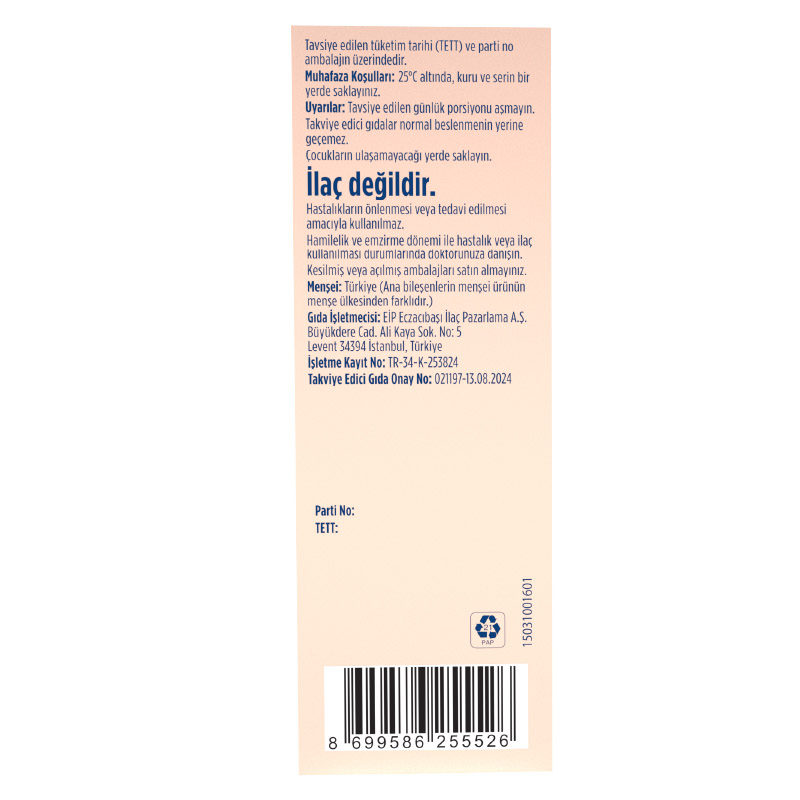 - Şeker, gluten, laktoz ve tatlandırıcı içermez.