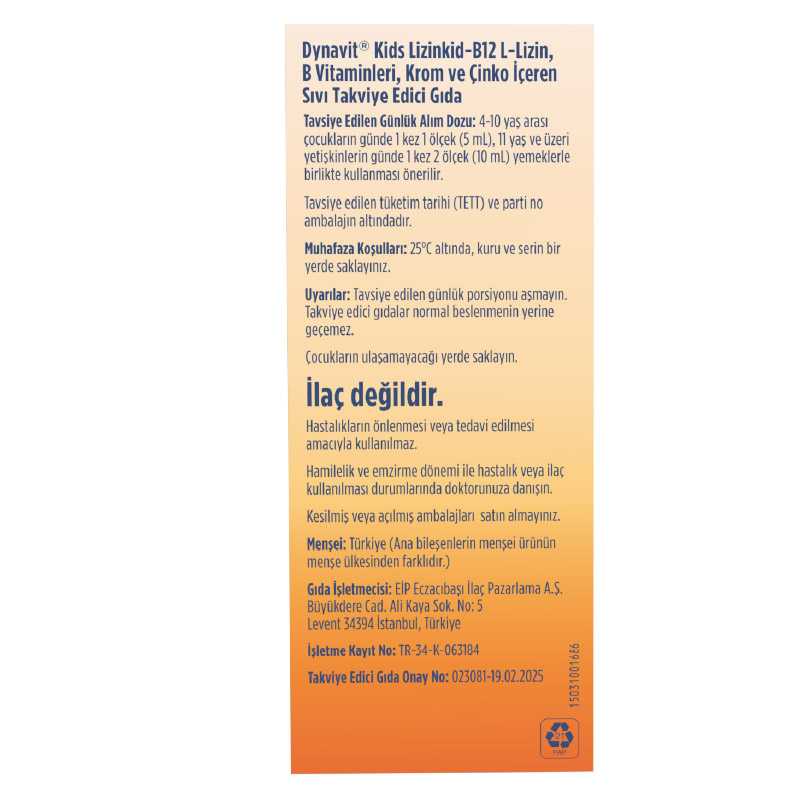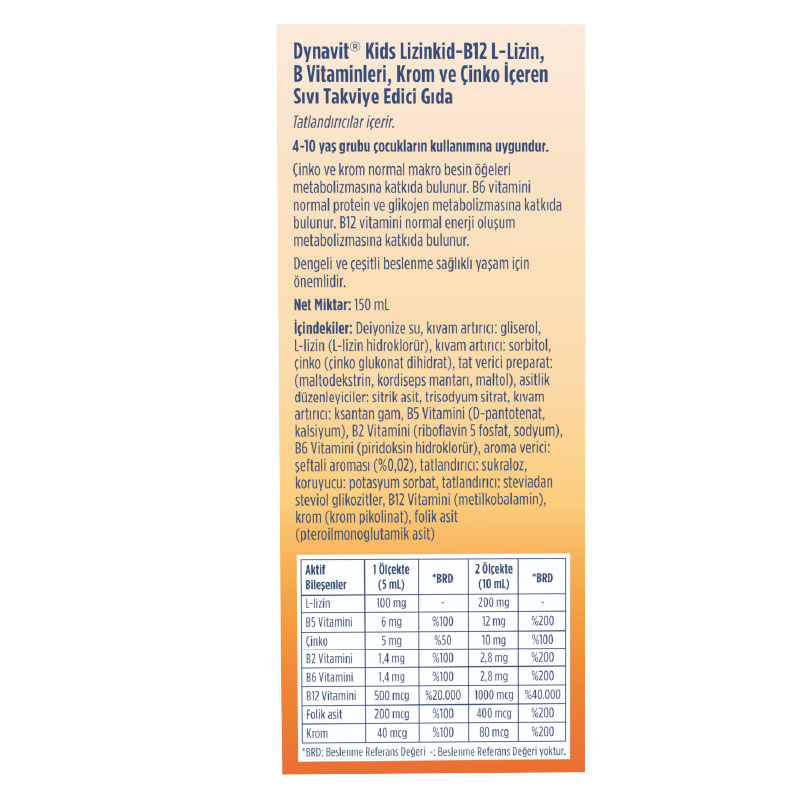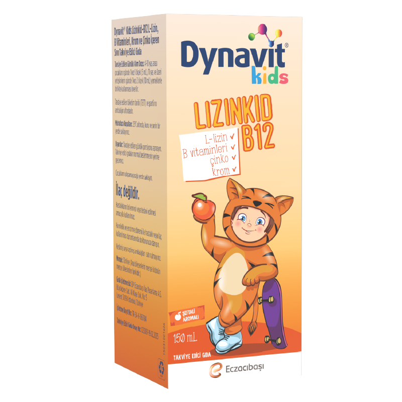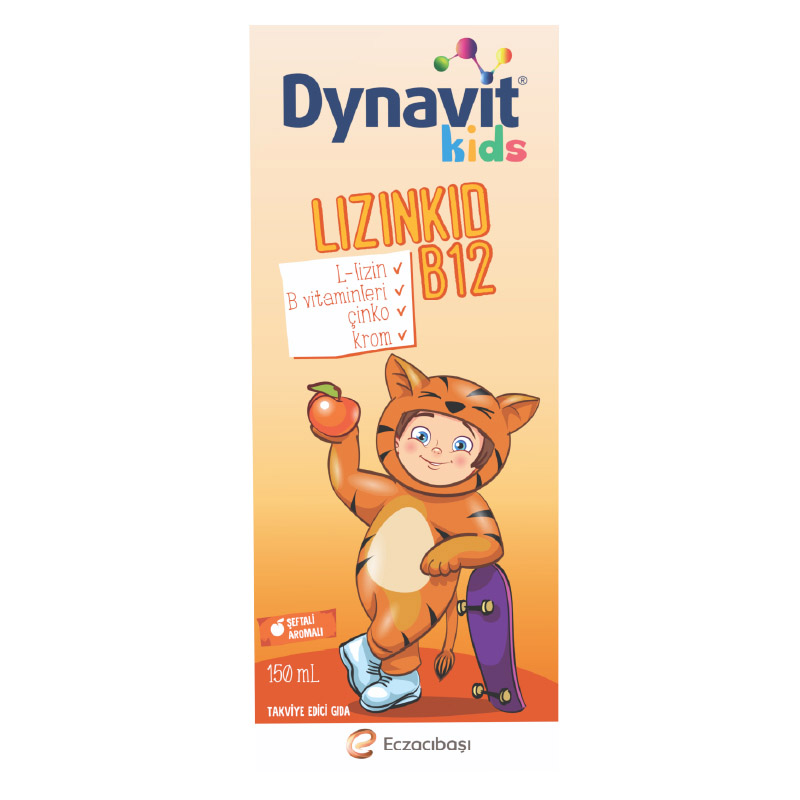 Dynavit Lizinkid + B12 Şurup içerisinde; B vitaminleri, selenyum, krom ve çinko yer alır. Özel formülü L-lizin ile desteklenmiştir. Bunlara ek olarak şeftali aromasına sahiptir ve bu sayede kullanım kolaylığı sağlar. Ayrıca gluten ve koruyucu içermez.