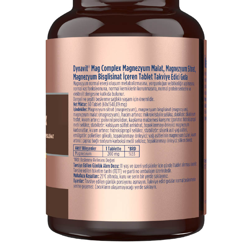 Dynavit Mag Complex 60 Tablet, magnezyumun üç farklı formu olan magnezyum malat, magnezyum sitrat ve magnezyum bisglisinat ile formüle edilmiştir. Gluten, laktoz ve şeker içermeyen yapısı sayesinde geniş bir kullanıcı kitlesine hitap eder. Günlük kullanıma uygun tablet formu ile pratik bir takviye seçeneği sunar.
