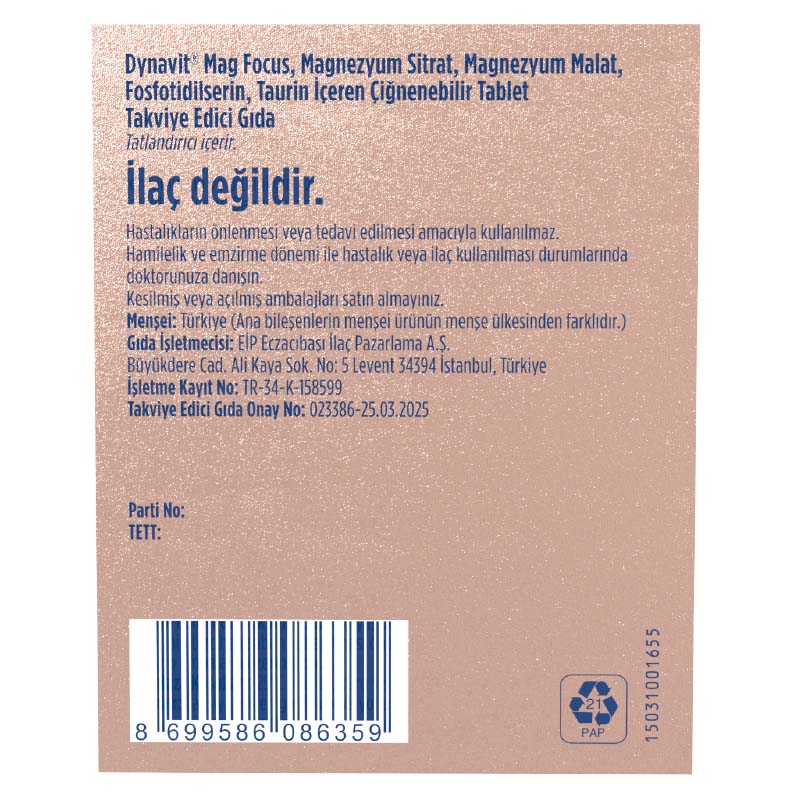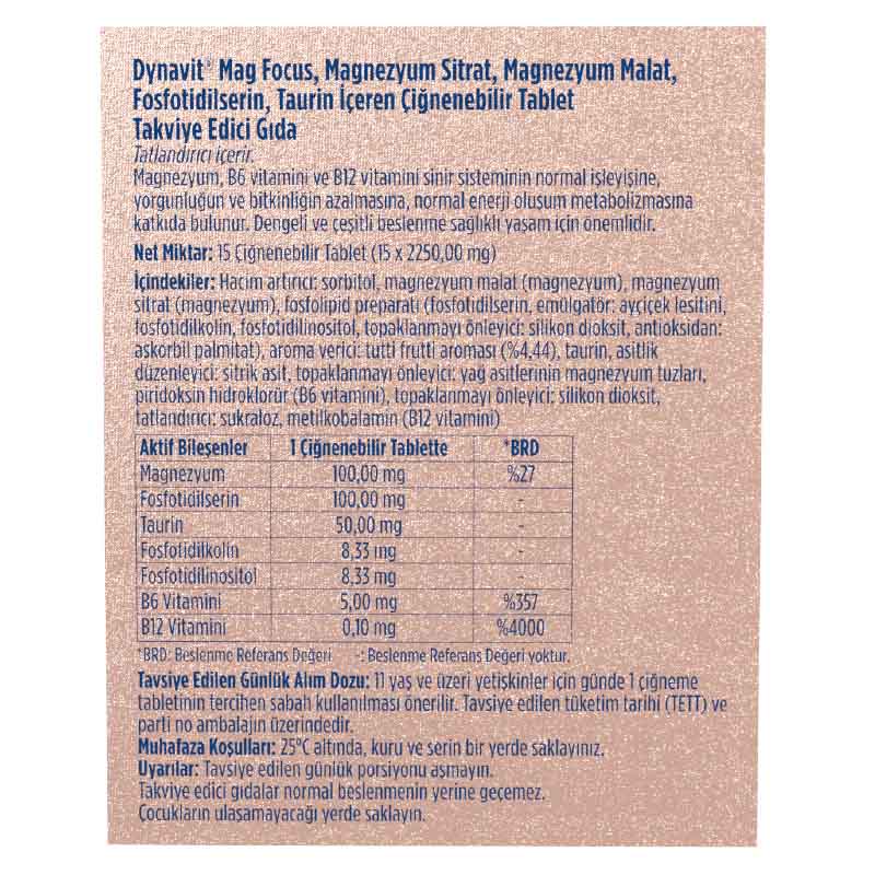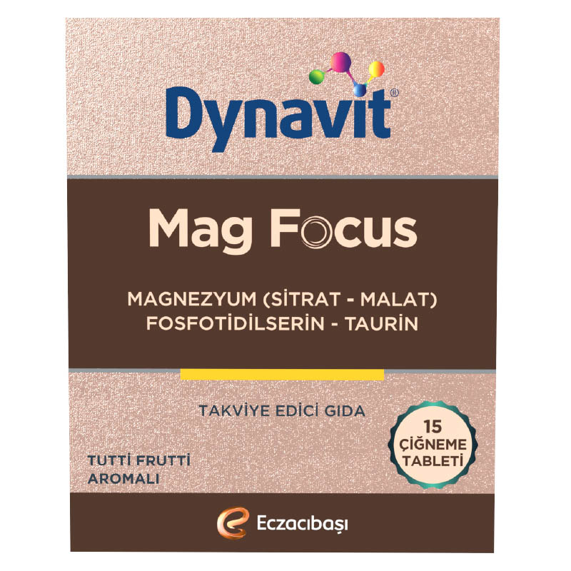 Dynavit Mag Focus 15 Çiğneme Tableti Tutti Frutti, magnezyum sitrat, magnezyum malat ve taurin içeriğiyle öne çıkan, fosfatidilserin ile zenginleştirilmiş özel bir formüle sahiptir. Çiğnenebilir formu ve tutti frutti aroması sayesinde pratik ve keyifli bir kullanım sunar. Gluten, şeker ve laktoz içermeyen yapısıyla güvenle tercih edilebilecek bir takviye seçeneği oluşturur.