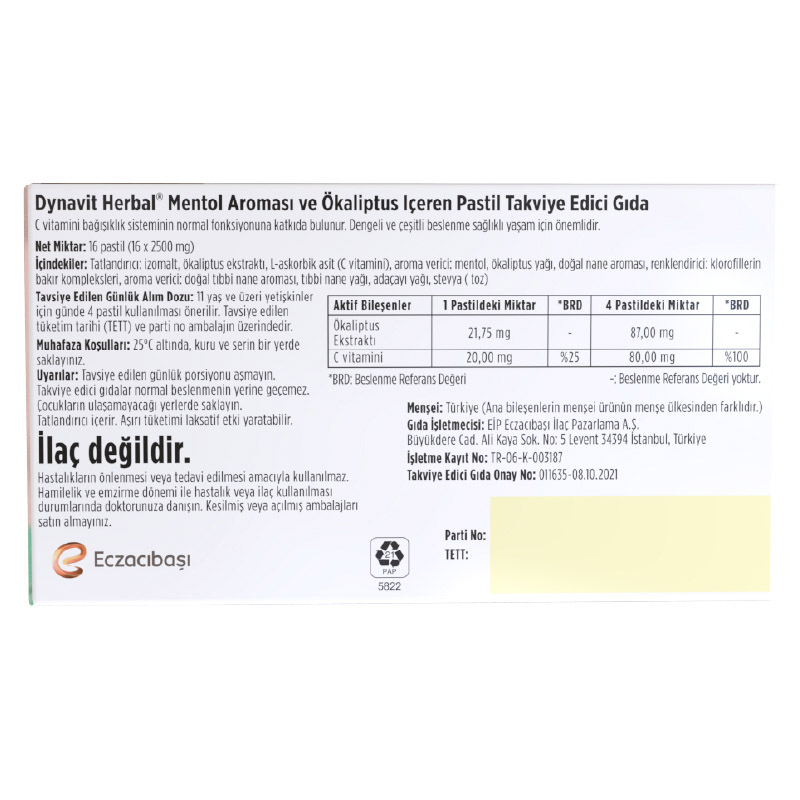 Dynavit Okaliptus + C Vitamini; farklı bileşenleri içeren formülüyle öne çıkar. İçerisinde C vitamini ve okaliptusun yanı sıra ginkgo ekstresi de bulunur. Nane aroması sayesinde kolay bir tüketim imkanı sunar. Ayrıca içerisinde şeker ve koruyucu yoktur.