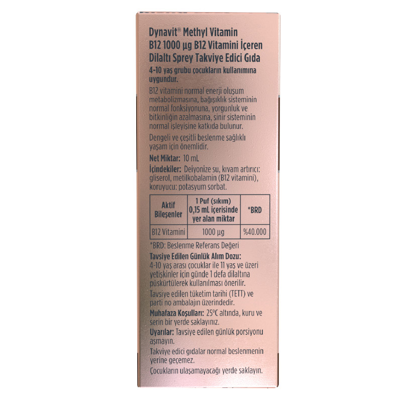 Dynavit Vitamin B12 1000 Mcg 10 mL, metilkobalamin formunda B12 vitamini içeren bir takviye edici gıdadır. Metilkobalamin, B12 vitamininin vücut tarafından dönüşüme ihtiyaç duymadan emilime hazır olan aktif koenzim formudur. Ürün, sprey ve damlalık aparatı sayesinde kolay ve pratik bir kullanım imkânı sunar. Gluten, laktoz, şeker ve renklendirici içermeyen formülüyle farklı beslenme tercihlerine de uygundur.