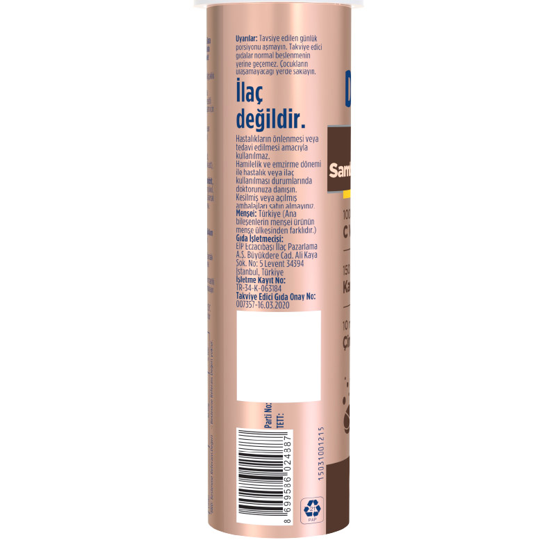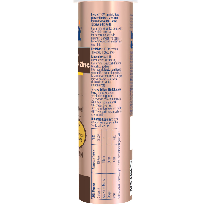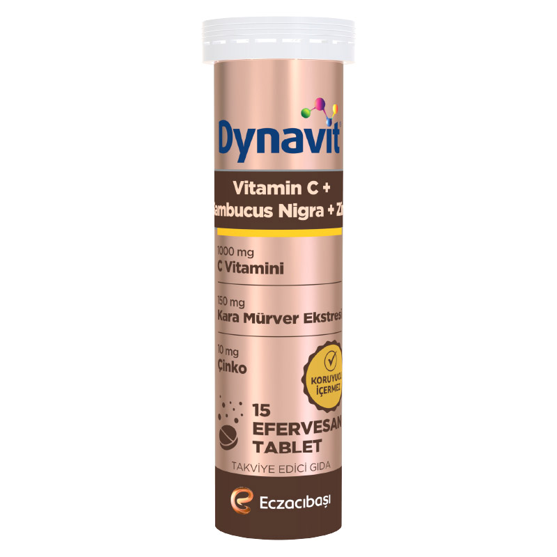 Dynavit Vitamin C + Sambucus Nigra, Her tabletinde 1000 mg C vitamini, 150 mg karamürver esktresi ve 10 mg çinko bulunan takviye edici bir gıdadır.