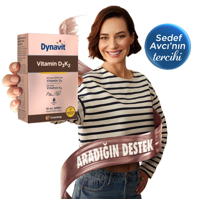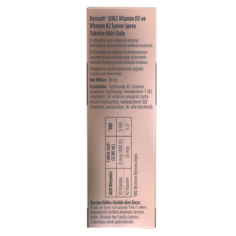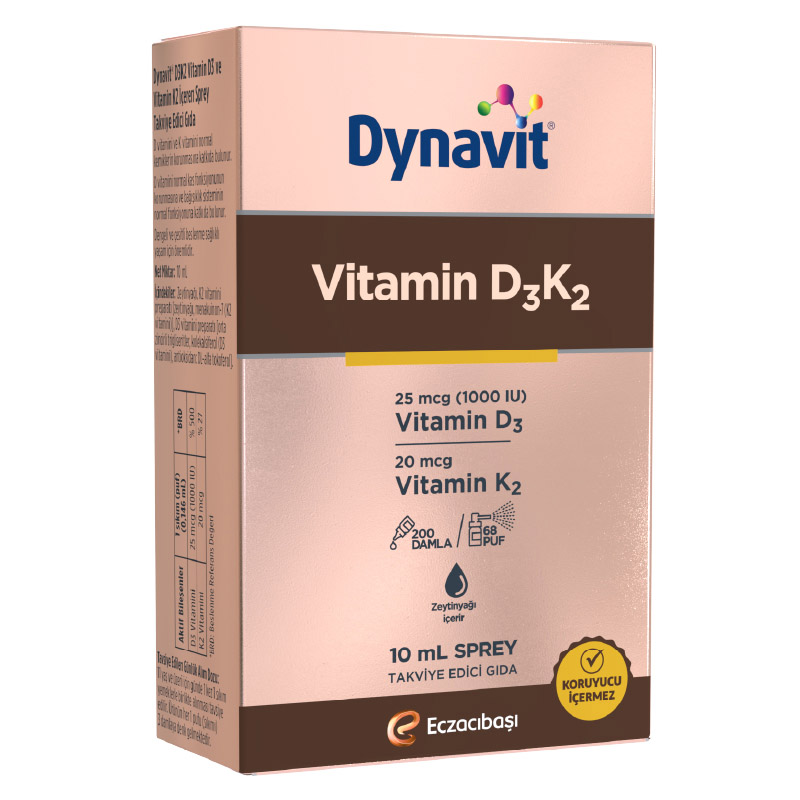 Dynavit Vitamin D3K2 Sprey, vücudun en önemli vitamin ihtiyaçlarından ikisi olan D vitamini ile K vitaminini aynı anda kazandırmak için formüle edilmiş bir gıda takviyesidir. Her püskürtmede 25 mcg D3 vitamini ve 100 mcg K2 vitamini desteği sunan ürün, iki vitaminin oluşturduğu sinerjik birleşim ile oldukça etkili bir vitamin takviyesi haline gelir. İçeriğinde doğal K2 vitamini formu olan menakinon bulunan Dynavit Vitamin D3K2 Sprey, yüksek emilim sağlamak için zeytinyağı ilavesi içerir. Sprey formu sayesinde kolayca kullanılabilir.