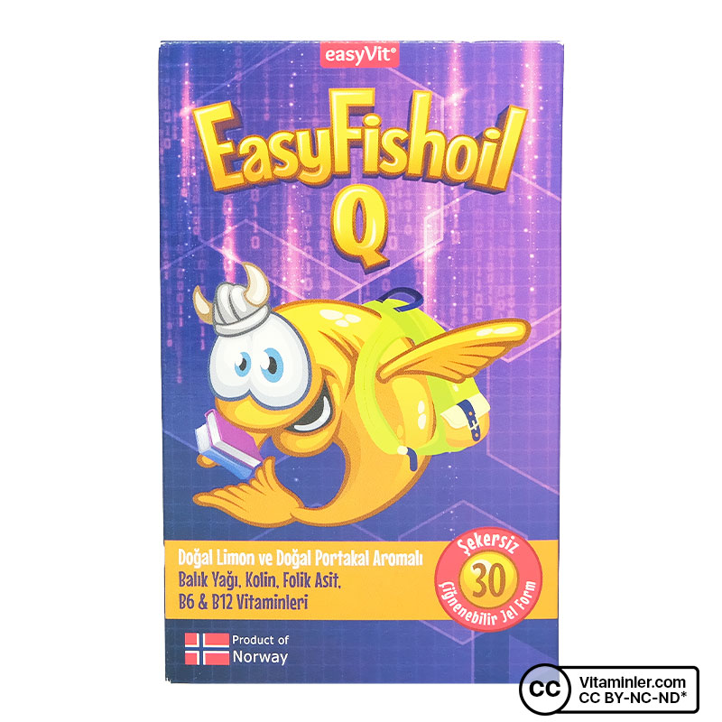 EasyVit Easy Q Kids 30 Çiğnenebilir Form, içeresinde Omega 3, Kolin, Folik Asit, B6 ve B12 vitaminleri bulunduran çocuklar için takviye edici bir gıdadır. Her kapsülünde 282 mg DHA ve 59 mg EPA bulunur.