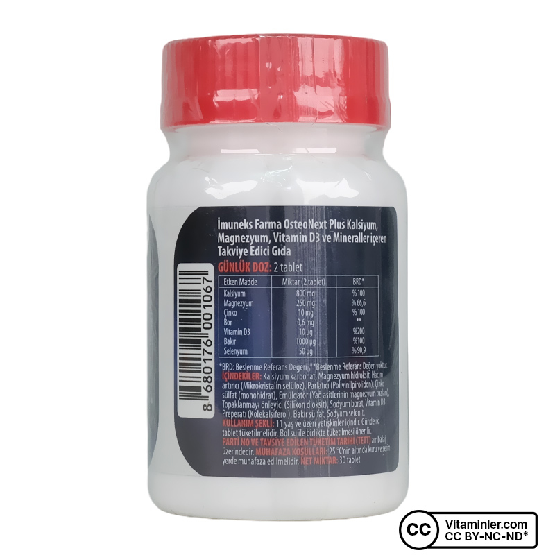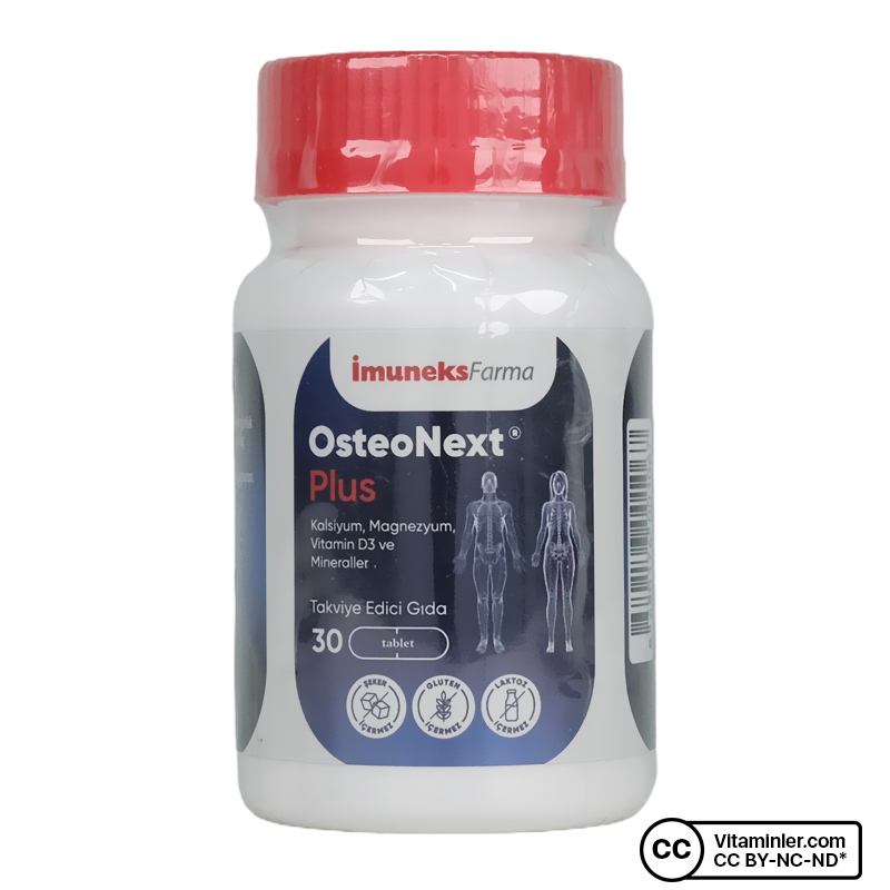 Imuneks Osteo Next Plus, her servisinde 800 mg kalsiyum ve 250 mg magnezyum sunan gıda takviyesidir. Formülasyonu; çinko, bor, bakır ve selenyum minerallerinin yanı sıra 10 µg (400 IU) D3 vitamini ile zenginleştirilmiştir. Şeker, gluten ve laktoz içermeyen formüle sahiptir.