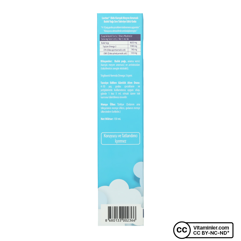Lectus Kids Balık Yağı; çocuklara yönelik olarak geliştirilen bir gıda takviyesidir. Her servisinde 4650 mg balık yağı (790 mg EPA ve 510 mg DHA) yer alır. IFOS (Uluslararası Balık Yağı Standartları) 5 yıldızlı üretim ayrıcalığına sahip formülü, sunduğu karışık meyve aromasıyla balık yağı tüketimini çocuklar için keyifli bir alışkanlığa dönüştürür.
