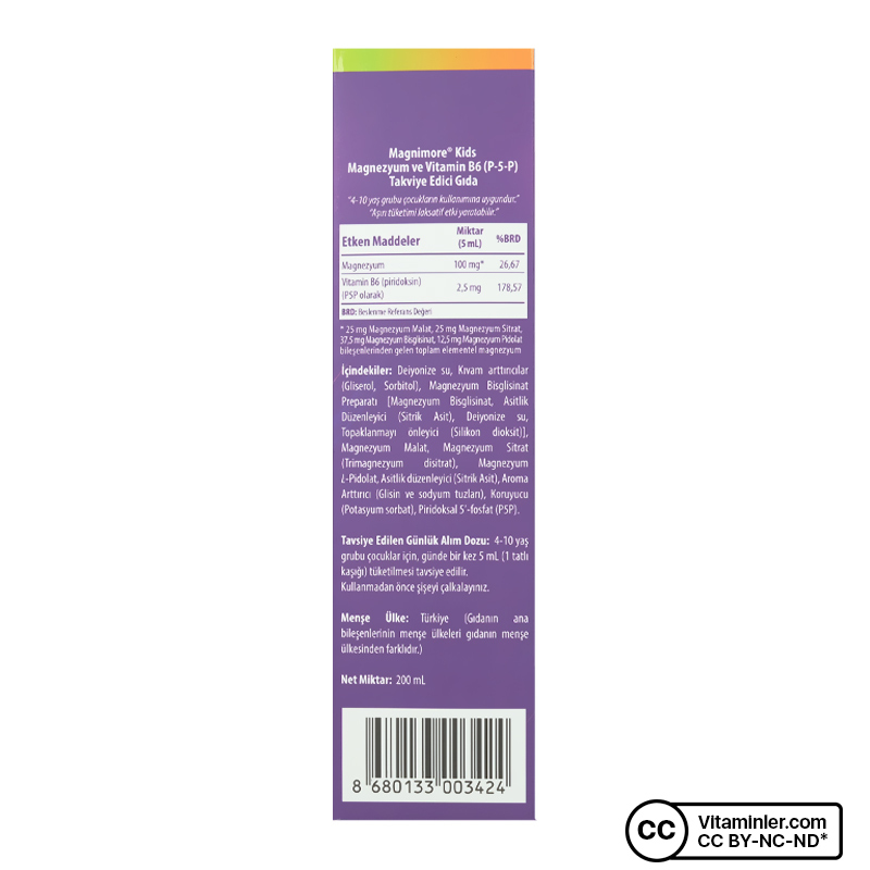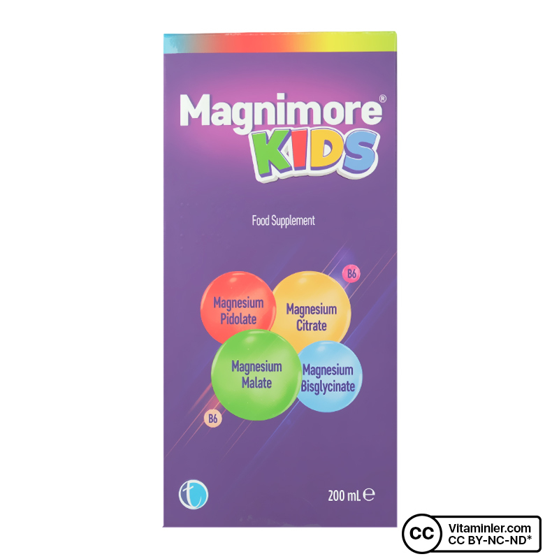 Magnimore Kids Magnezyum B6; çocukların günlük magnezyum ihtiyacını desteklemek amacıyla geliştirilmiş bir takviye edici gıdadır. Her servisinde 100 mg magnezyum sunan gıda takviyesi 4 farklı magnezyum türü içerir. B6 vitamini ile zenginleştirilmiş formülü ve sıvı formu sayesinde pratik bir tüketim imkanı sunar.