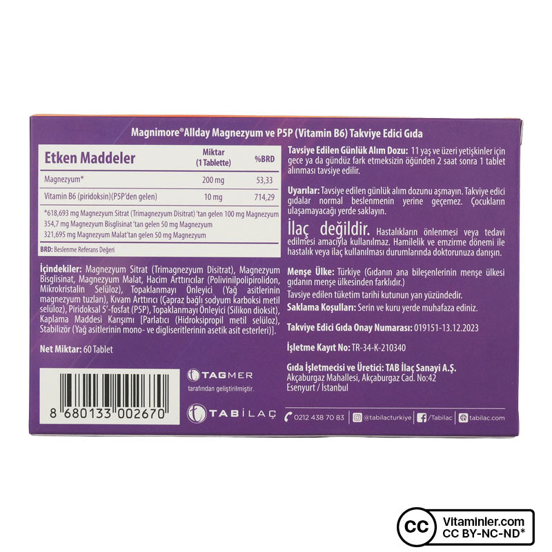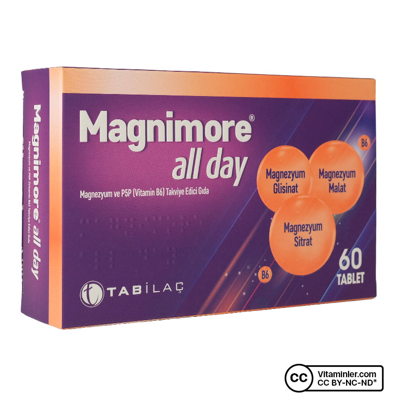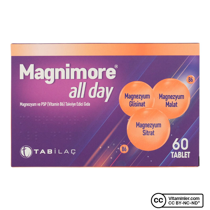 Magnimore All Day, her bir tablette 200 mg magnezyum içeren bir gıda takviyesidir. Magnezyum bisglisinat, magnezyum sitrat ve magnezyum malat formlarının kombinasyonunu içerir. B6 vitamini ile desteklenmiş formülü ile öne çıkar. Her serviste 10 mg B6 vitamini bulunur. Ürün, 11 yaş ve üzeri kişilere yöneliktir. Gündüz veya gece, öğünlerden yaklaşık 2 saat sonra bir tablet alınması önerilir.