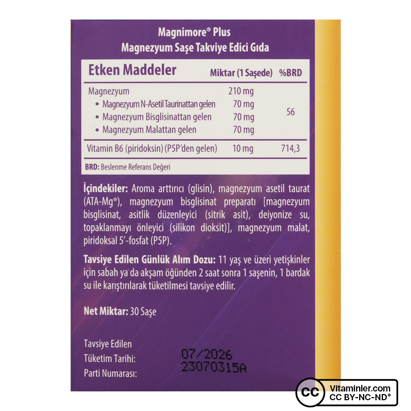 Magnimore Plus, her servisinde 210 mg magnezyum desteği içerir. İçerisinde 3 farklı magnezyum kombinasyonu bulunmasıyla öne çıkan gıda takviyesi, saşe formu ile kolay bir tüketim ve pratik şekilde taşıma imkanı sunar.