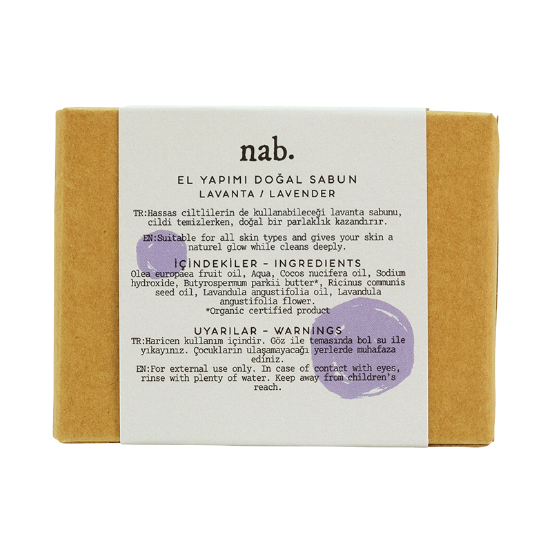 Nab. Doğal El Yapımı Lavanta Sabunu, içerisinde lavanta esansiyel yağı içeren bir sabundur. Sabun, %100 doğal malzemelerden üretilmesi ile öne çıkar. Yüz, el ve vücut kullanımına uygun olan bu sabun, saf zeytinyağı kullanılarak üretilmiştir. Bunların yanı sıra Nab. Doğal El Yapımı Lavanta Sabunu, Ecocert / COSMOS sertifikalı ham maddelerden oluşmaktadır.
