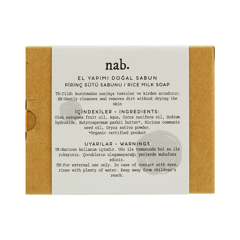 Nab. Doğal El Yapımı Pirinç Sütü Sabunu, %100 doğal içeriklerden üretilen bir sabundur. Cilt bakım rutininde kullanıma uygun olan pirinç sütü sabununun, nemli cilde köpürtülerek kullanılması önerilir. Bunların yanı sıra Nab. Doğal El Yapımı Pirinç Sütü Sabunu, saf zeytinyağından oluşan içeriği ile ön plana çıkar. Ayrıca Ecocert / COSMOS sertifikalı ham maddeleri içerir.