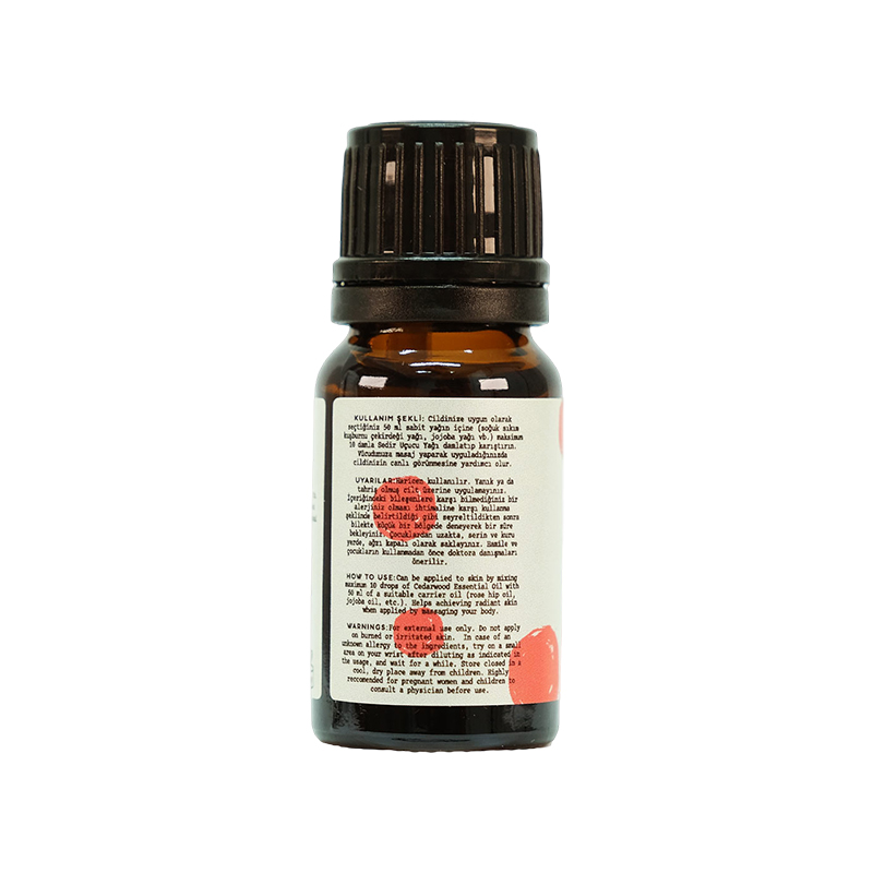 Cildinize uygun olarak seçtiğiniz 50 ml sabit yağın içine (soğuk sıkım kuşburnu çekirdeği yağı, jojoba yağı vb.) maksimum 10 damla Sedir Uçucu Yağı damlatıp karıştırın. Vücudunuza masaj yaparak uyguladığınızda cildinizin canlı görünmesine yardımcı olur.