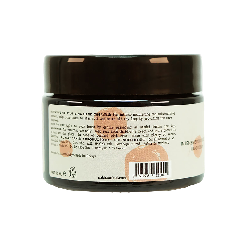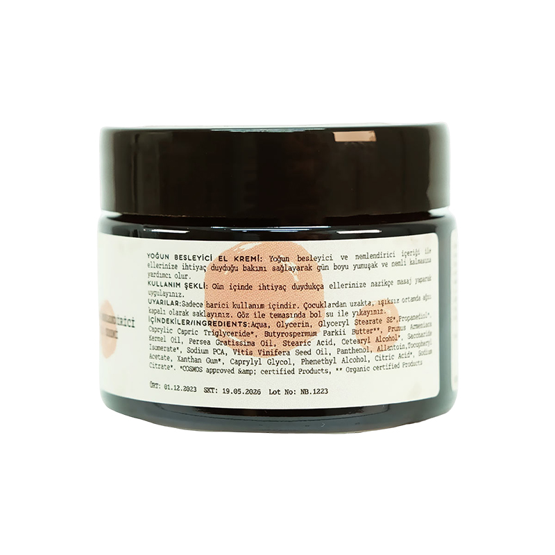 Nab. Yoğun Nemlendiricili El Kremi, yoğun besleyici ve nemlendirici içeriği ile öne çıkar. Bu içeriği sayesinde ellerinize ihtiyaç duyduğu bakımı sağlayarak gün boyu yumuşak ve nemli kalmasına yardımcı olur. Bunların yanı sıra içeriğinde bulunan avokado yağı, shea butter ve kayısı çekirdeği yağı ile ellerin nemlendirilmesine yardımcı olur. Nab. Yoğun Nemlendiricili El Kremi, bitkisel içerikli bileşenlerden oluşur.