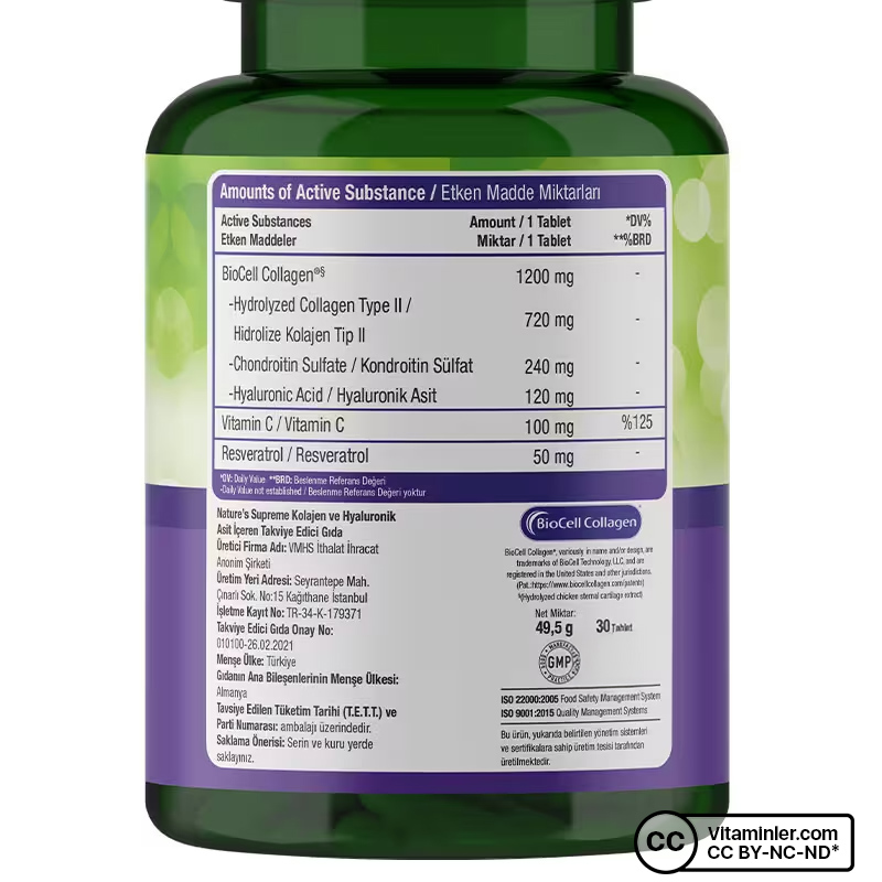Nature's Supreme Collagen Hyaluronic Acid, zengin içeriği ile kolajen takviyesi ihtiyacına kompleks bir alternatif olarak sunulan bir gıda takviyesidir. Almanya menşeili BioCell Collagen® ham maddesi kullanılarak formüle edilen ürünün içeriği; hidrolize tip 2 kolajen, kondroitin sülfat ve hyaluronik asitin birleşiminden meydana gelir. Bunların yanı sıra C vitamini ve resveratrol ile zenginleştirilen Nature's Supreme Collagen Hyaluronic Acid, her servisinde 1200 mg BioCell Collagen® sunar.