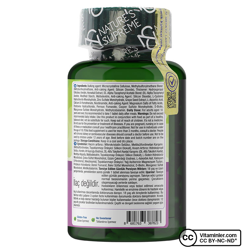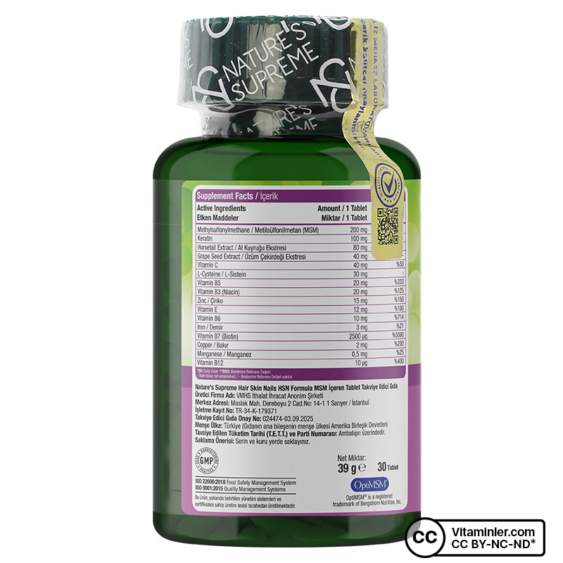 Nature’s Supreme HSN Hair & Skin & Nails 30 Tablet, dengeli içeriğiyle dikkat çeken bir gıda takviyesidir. Formülünde yer alan 16 farklı bileşen, vitamin ve minerallerin bir araya getirildiği kapsamlı bir kombinasyon oluşturur. B3 (niasin), B5, B6, B7 (biotin) ve B12 vitaminlerini içerir. Aynı zamanda; MSM, keratin ve at kuyruğu ekstresi ile üzüm çekirdeği ekstresi gibi bitkisel bileşenler ile desteklenmiştir. Formülünde OptMSM ham maddesi bulunur ve ürün gluten ile tatlandırıcı içermeyecek şekilde hazırlanmıştır. Günlük kullanım için uygun olan bu formül, pratik 30 tabletlik ambalajıyla öne çıkar.