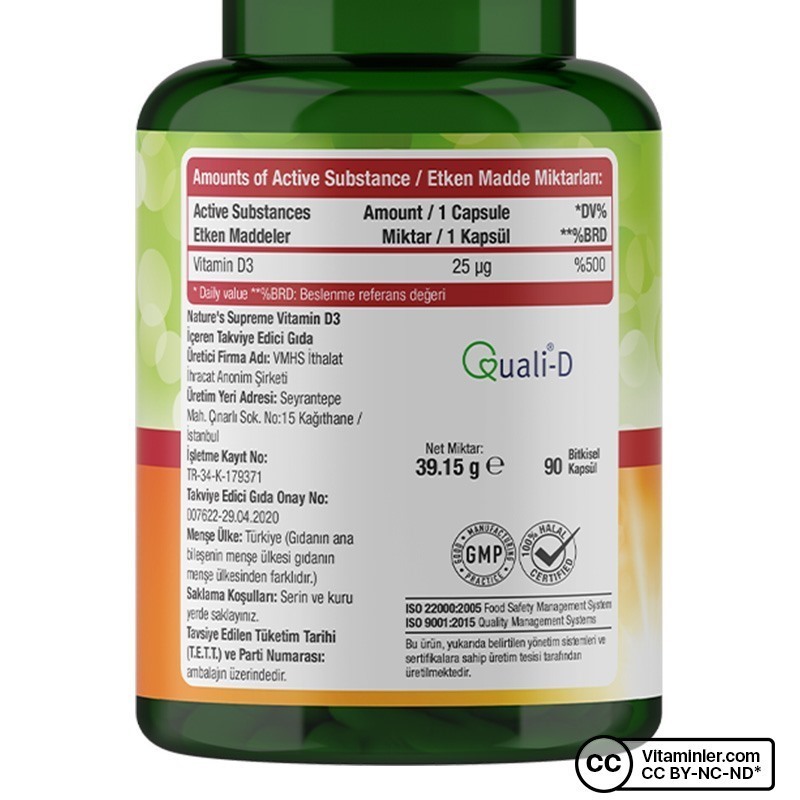 Nature’s Supreme D3 her bitkisel kapsülde 25 mcg (1000 IU) D3 vitamini içerir. Bu üründe patentli Quali®-D marka ham madde kullanılmıştır. Bitkisel kapsül kullanması sayesinde vejetaryen kullanımına uygundur.