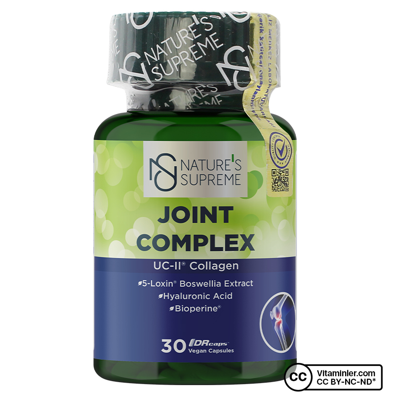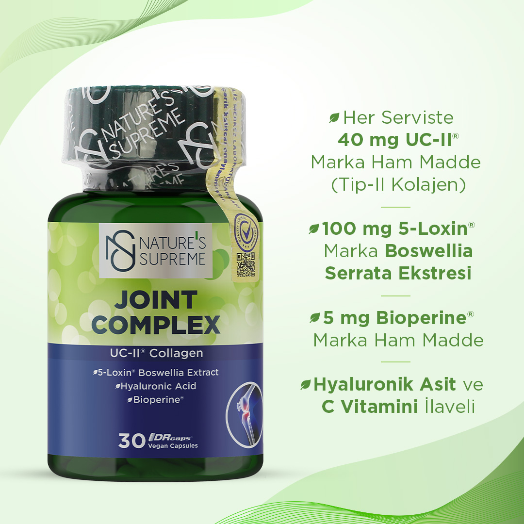 Nature’s Supreme UC-II Joint Complex, eklem fonksiyonlarına yönelik olarak formüle edilmiş bir takviyedir. İçeriğinde UC-II® kaynaklı Tip II kolajen, Boswellia Serrata ekstresi (5-Loxin®), C vitamini, hyaluronik asit, manganez ve Bioperine® gibi bileşenler bulunur. Gluten ve tatlandırıcı içermeyen yapısıyla öne çıkan ürün, GMP ve ISO sertifikalı tesislerde, yüksek kalite standartlarına uygun şekilde üretilir.