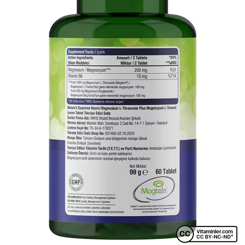 Nature's Supreme Mag Neuro Complex, magnezyum L-threonat içeren özel bir formüle sahiptir. Magtein® ham maddesi kullanılarak geliştirilmiş formülü aynı zamanda magnezyum bisglisinat ve vitamin B6 ile zenginleştirilmiştir.