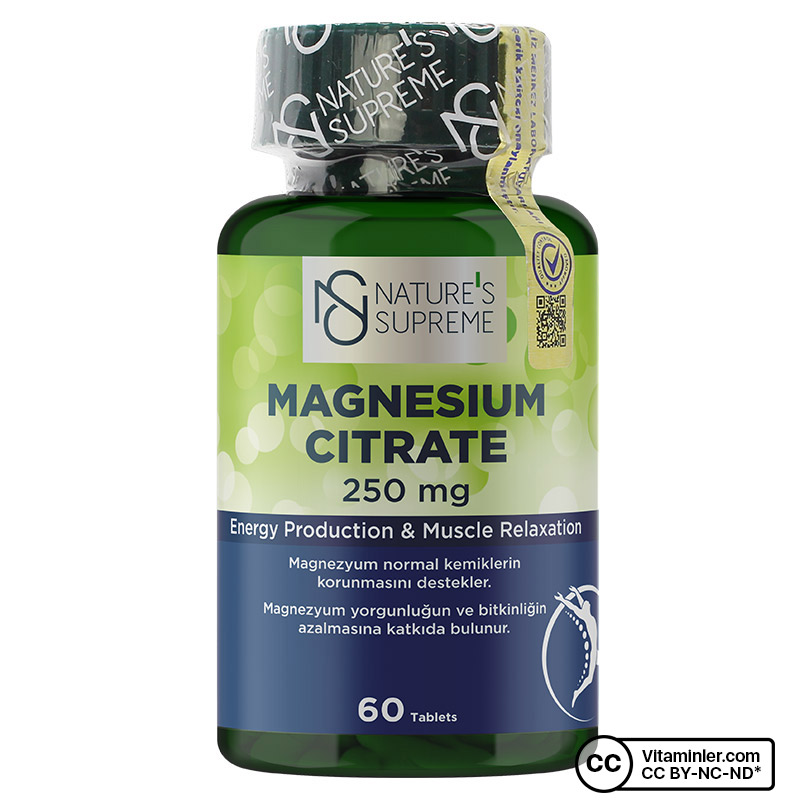 Nature's Supreme Magnesium Citrate ürünü, magnezyum minerali içeren bir besin desteğidir. Bu üründeki her bir tablet, 250 mg magnezyum minerali takviyesi sağlamaktadır. Nature's Supreme markasının bu formülasyonu, mineral kaynağı olarak yüksek seviyede biyoyararlanım imkanı tanıyan sitrat formunda magnezyum içermektedir.