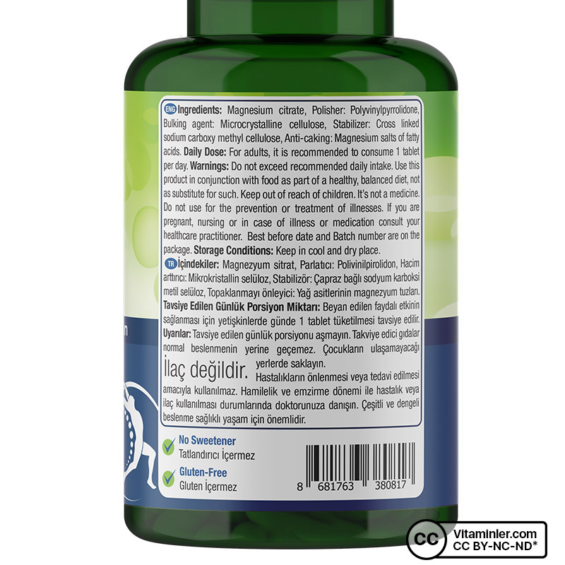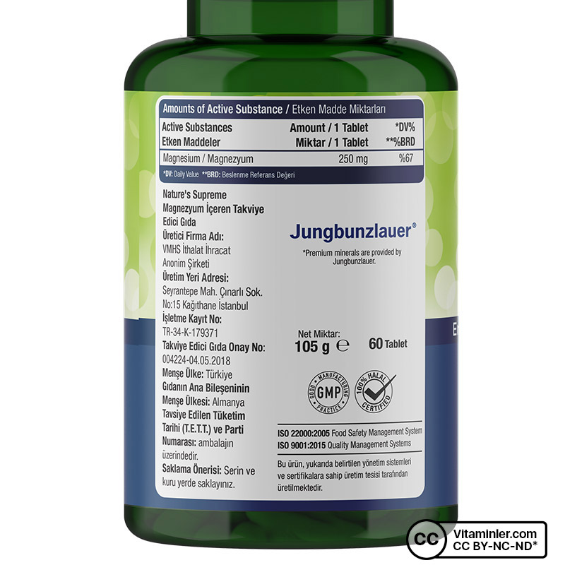 - Nature's Supreme Magnesium Citrate 250 Mg içeriğinde bulunan magnezyum mineralinin normal kemik ve normal dişlerin korumasına desteği,