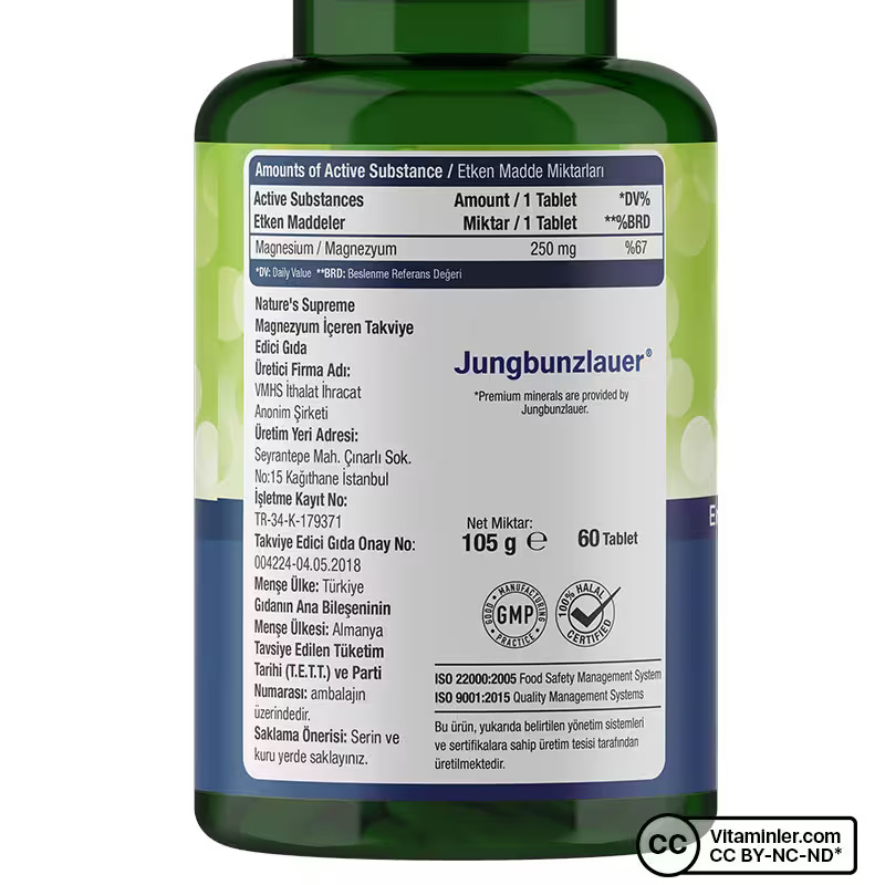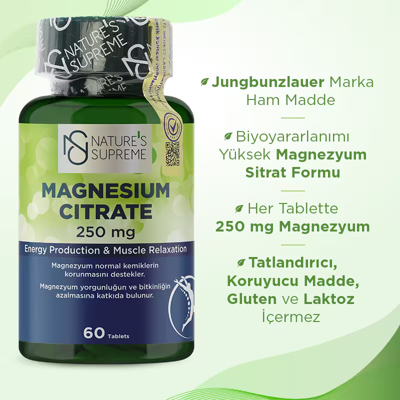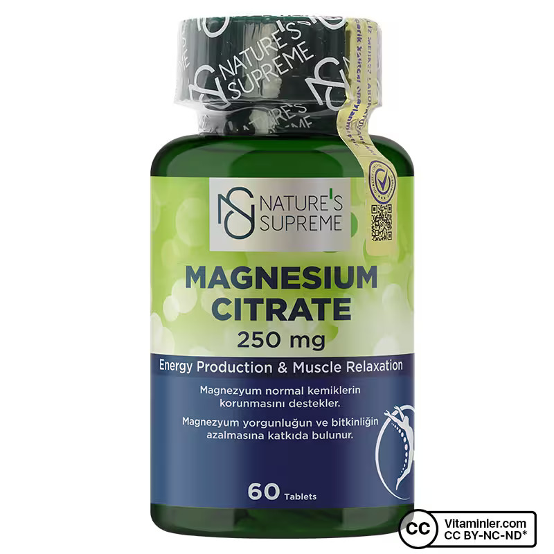 Nature's Supreme Magnesium Citrate ürünü, magnezyum minerali içeren bir besin desteğidir. Bu üründeki her bir tablet, 250 mg magnezyum minerali takviyesi sağlamaktadır. Nature’s Supreme markasının bu formülasyonu, mineral kaynağı olarak yüksek seviyede biyoyararlanım imkanı tanıyan sitrat formunda magnezyum içermektedir.