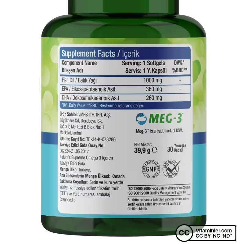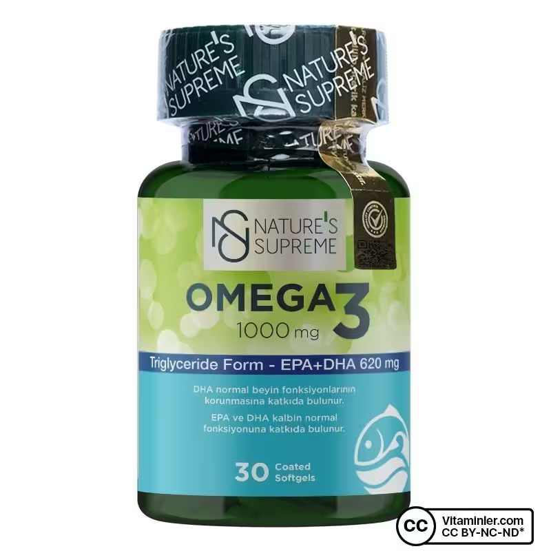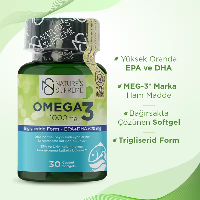 Nature's Supreme Omega 3 1000 Mg ürünü, yüksek oranda omega 3 yağ asidi sağlayan trigliserid forma sahip balık yağı içerikli besin takviyesidir. Tek bir kapsülde 360 mg EPA ve 260 mg DHA omega 3 yağ asidi bulunmaktadır.