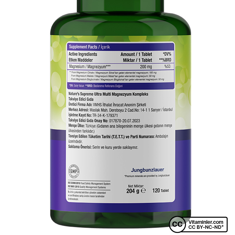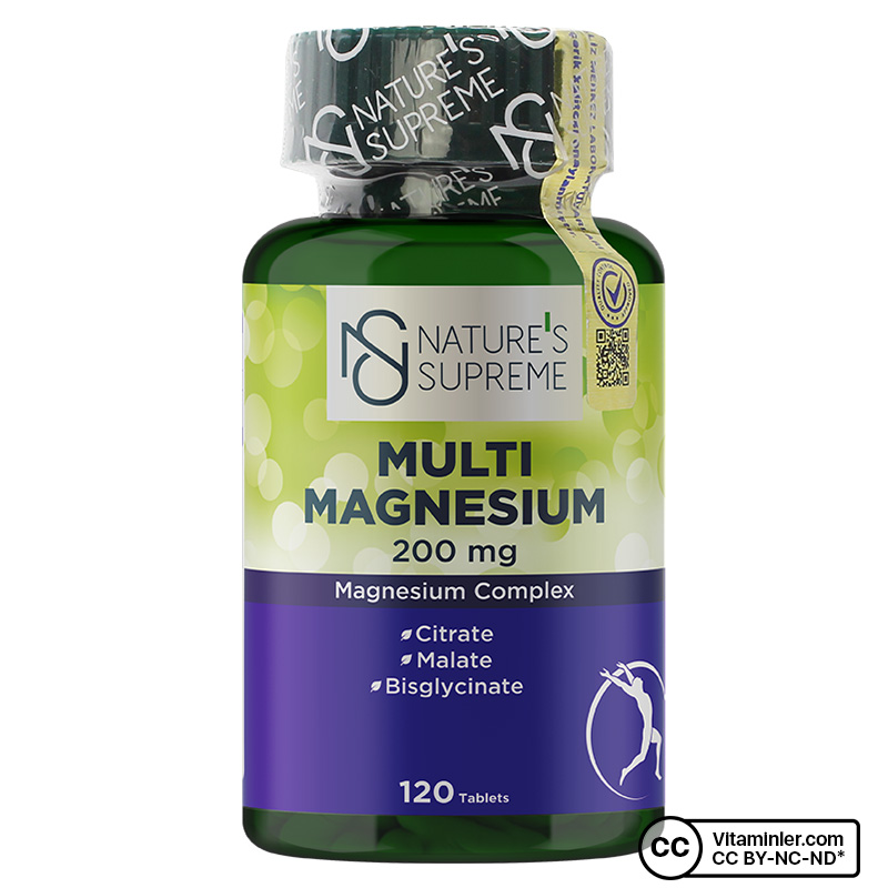 Nature's Supreme Multi Magnesium, magnezyum mineralini 3 farklı ve yüksek emilimli formda bir arada sunan bir takviyedir. Her tablette toplam 200 mg elementel magnezyum bulunur ve bu magnezyum, 100 mg magnezyum sitrat, 50 mg magnezyum malat ve 50 mg magnezyum bisglisinat şeklinde sağlanır.