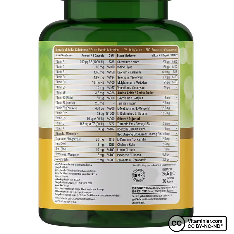 Nature's Supreme Multivitamin for Men 30 Kapsül, erkeklerin günlük vitamin ve mineral ihtiyacını karşılamak üzere özel olarak formüle edilmiş bir gıda takviyesidir. İçeriğinde zerdeçal, koenzim Q10 ve ginseng gibi bitkisel içerikler yer alırken, vitamin bileşenleri dünyanın önde gelen üreticilerinden biri olan DSM’in patentli markası Quali®-Blends ile sağlanmaktadır. Bu sayede ürün, yüksek kalite ve güvenilirlik sunar.