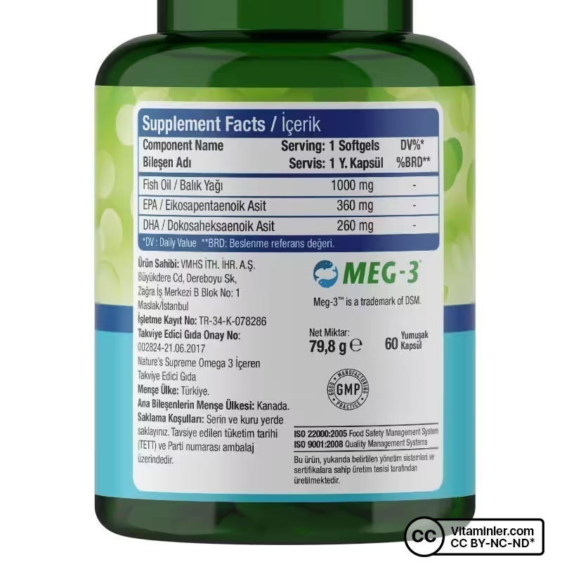 Nature's Supreme Omega 3 1000 Mg ürünü, yüksek oranda omega 3 yağ asidi sağlayan trigliserid forma sahip balık yağı içerikli besin takviyesidir. Tek bir kapsülde 360 mg EPA ve 260 mg DHA omega 3 yağ asidi bulunmaktadır. EPA ve DHA, kalbin normal fonksiyonuna katkıda bulunur+. DHA normal beyin fonksiyonlarının korunmasına katkıda bulunur+.