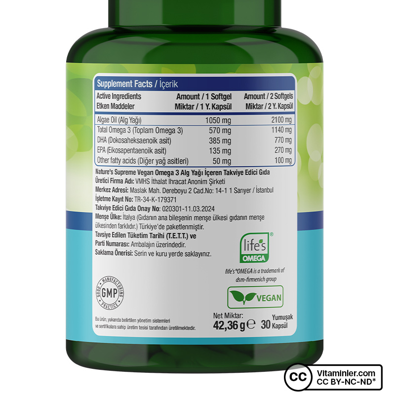 Balıkların omega-3 zenginliğinin kaynağı aslında mikroalglerdir ve Nature’s Supreme Vegan Omega, patentli Life’s Omega® ham maddesi ile bu kaynağa doğrudan ulaşır. Böylece balık kullanımını ortadan kaldırarak çevre dostu, saf ve sürdürülebilir bir omega-3 çözümü sunar. Her kapsülde 570 mg omega-3 yağ asidi bulunur; bunun 385 mg’ı DHA (Dokosaheksaenoik Asit), 153 mg’ı ise EPA (Eikosapentaenoik Asit) formundadır.