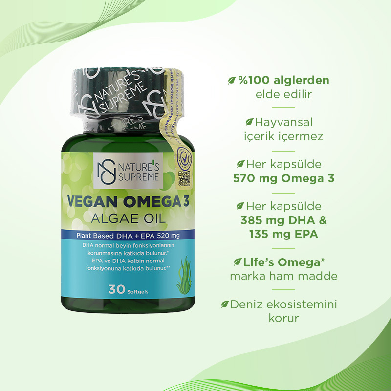 Nature’s Supreme Vegan Omega, her kapsülde 570 mg omega-3 yağ asidi sağlayan, tamamen bitkisel kaynaklı bir omega-3 türüdür. Sürdürülebilir ve saf formülü sayesinde balık yağına alternatif olarak geliştirilmiştir. Omega-3’ün temel bileşenleri olan DHA (Dokosaheksaenoik Asit) ve EPA (Eikosapentaenoik Asit), doğrudan alglerden elde edilir. Böylece hem çevre dostu hem de ağır metal veya toksin riski taşımayan güvenilir bir omega-3 kaynağı sunar.