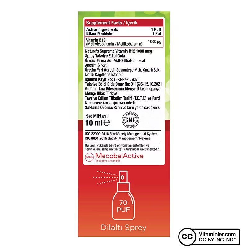 Nature's Supreme Vitamin B12 1000 Mcg Methylcobalamin Sprey, metilkobalamin formunda B12 vitamini içeren pratik kullanımlı bir gıda takviyesidir. Mecobal Active markalı, aktif B12 formu içermesiyle dikkat çeken bu ürün, dilaltı sprey formu sayesinde hızlı emilim sağlar. Tatlandırıcı, renklendirici ve gluten içermeyen formülüyle 70 günlük kullanım sunar.
